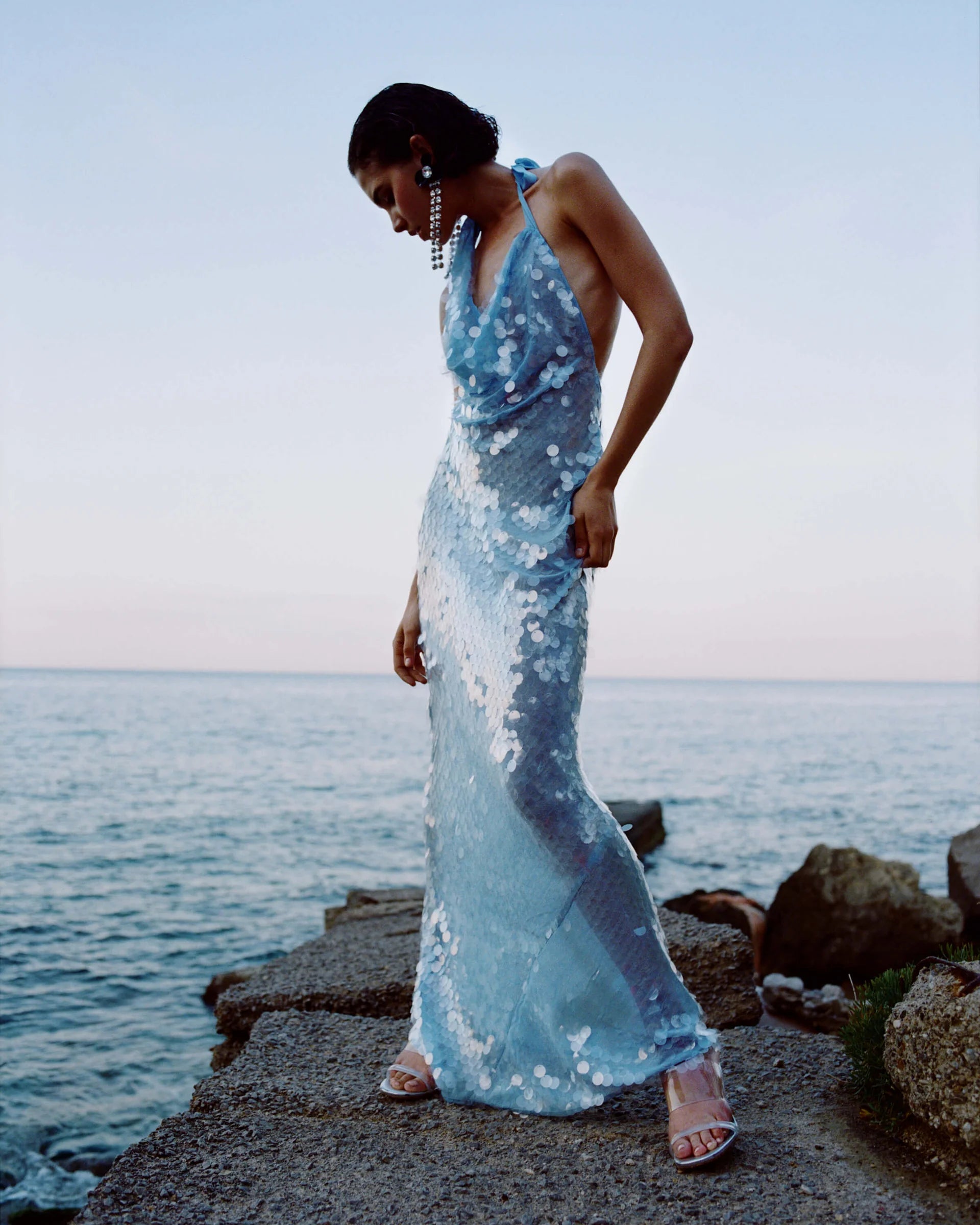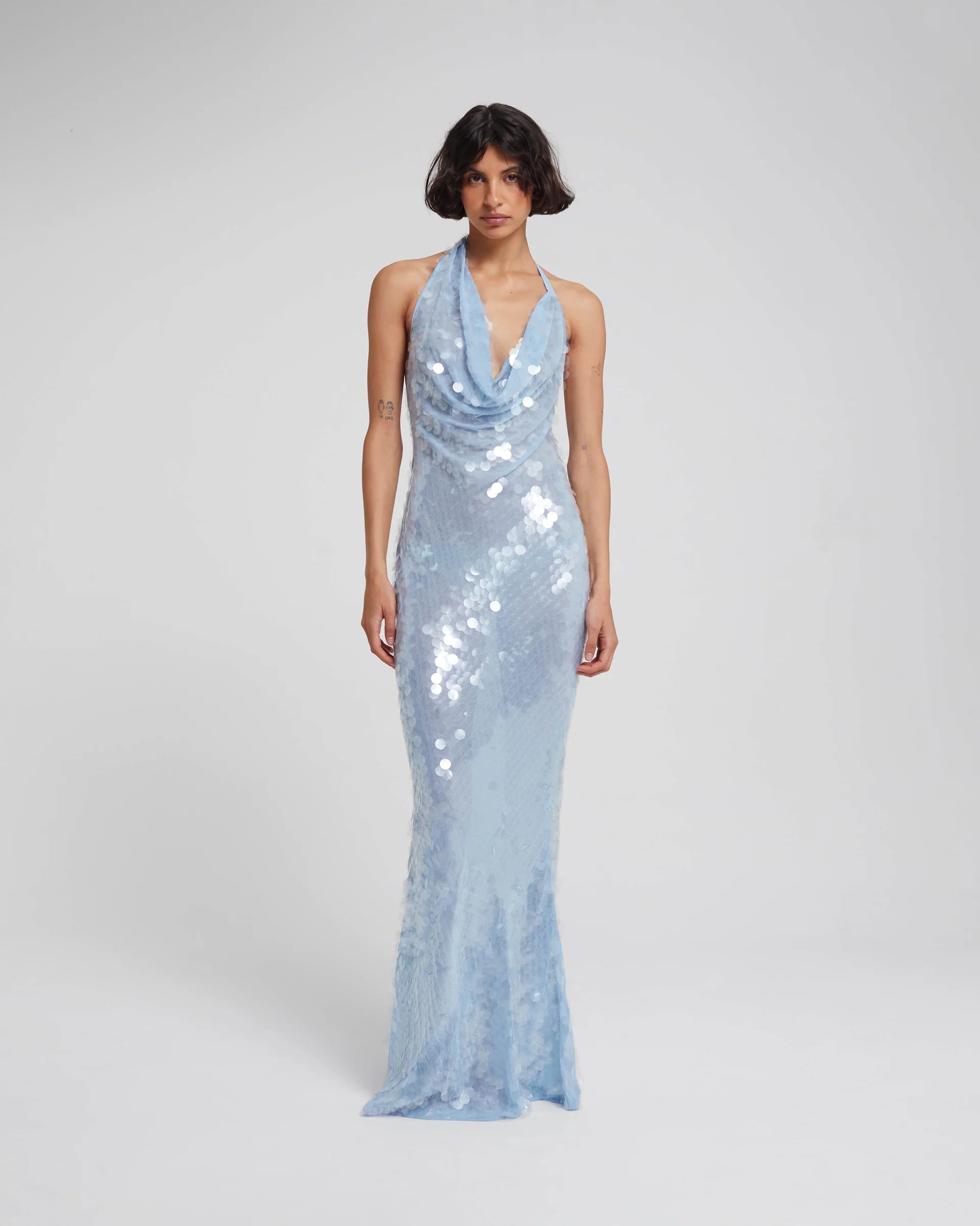 Drenched in cornflower blue paillettes from neckline to hem, Anais shimmers and glistens like the sun on water. An adjustable cowl neckline and waist tie makes it easy to find your perfect fit.