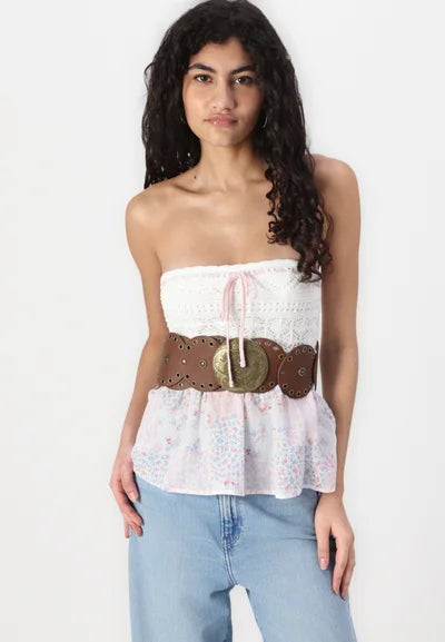 This delicate smocked tube top features a soft crochet-knit bust and a flowy floral lower half—perfect for sunny days and sweet escapes. Pair it with denim or a maxi skirt for an effortless, feminine look.