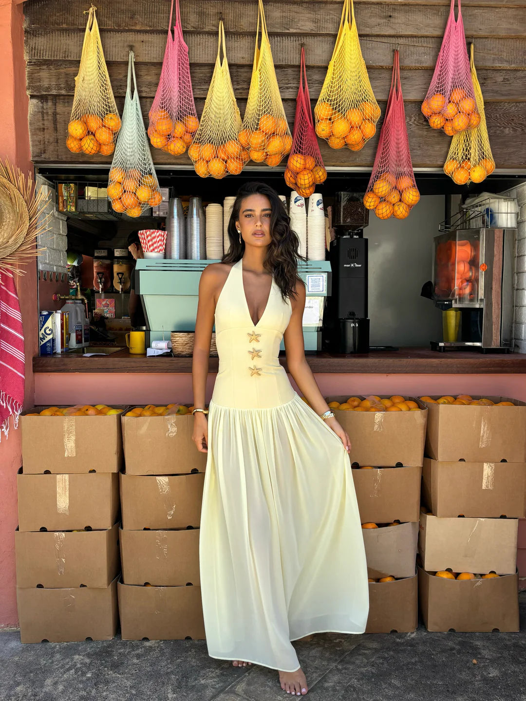 Designed with a soft and dreamy vibe, the Eleanora | Star Sunset Dress features a beautiful pale yellow hue with a halter neckline that showcases your shoulders and neckline. The intricate gold buttons down the front add a touch of elegance, while the flowing skirt creates a flattering, relaxed silhouette perfect for evening soirées, beach parties, or special gatherings.