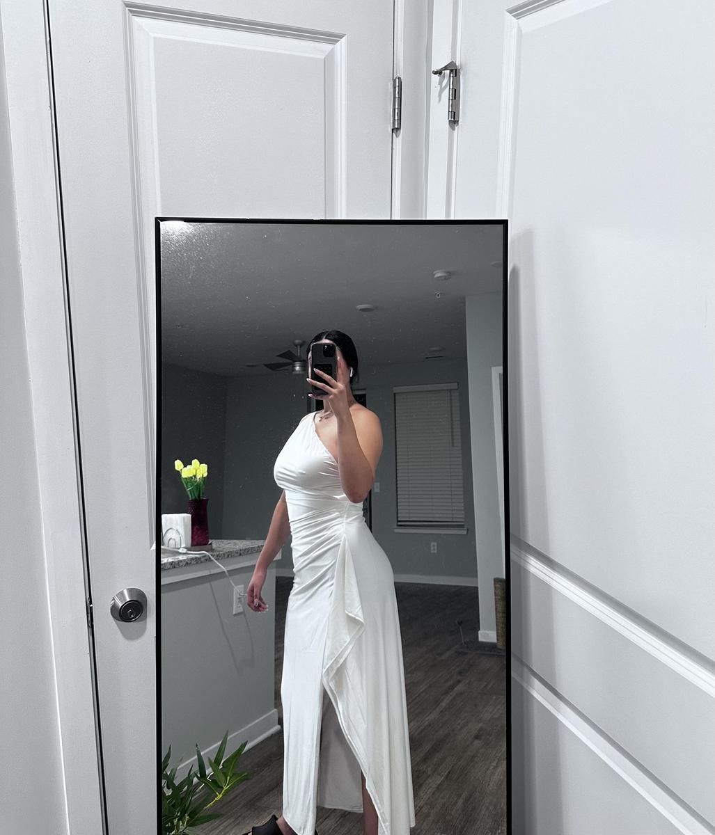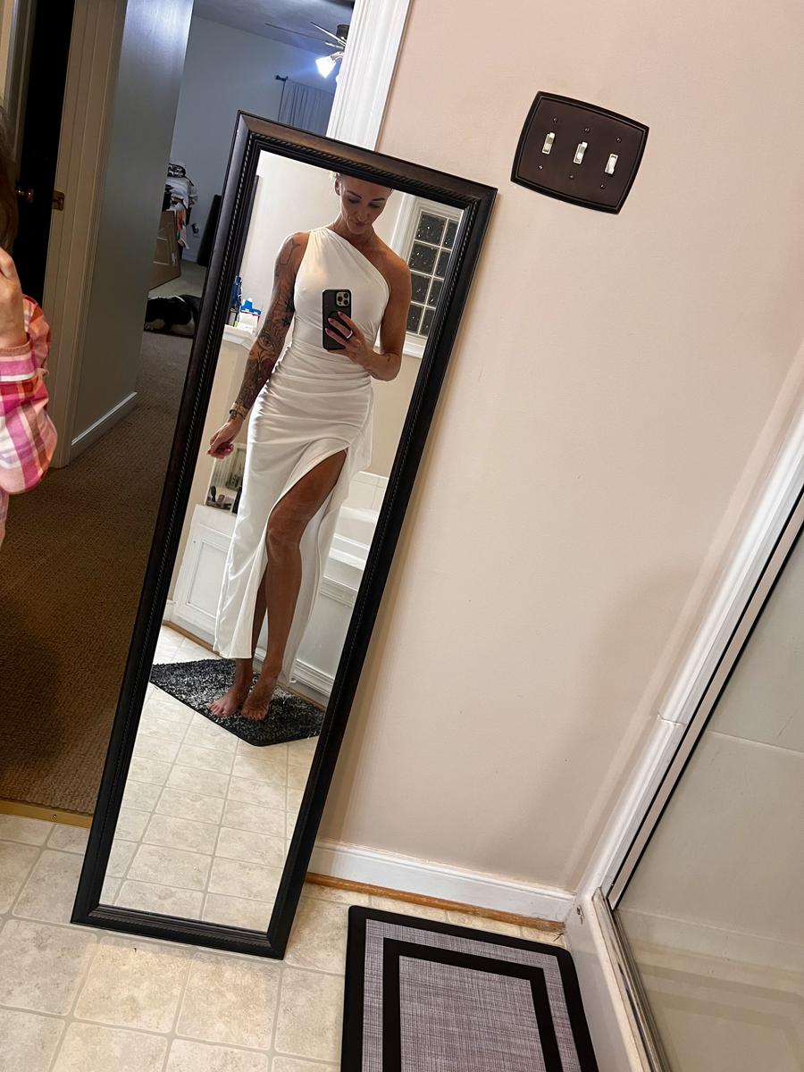 This figure-flattering satin gown features a built-in waist-cinching structure that hugs your curves and enhances your silhouette—no corset needed. Luxury sheen, high slit, and one-shoulder draping made to turn heads.